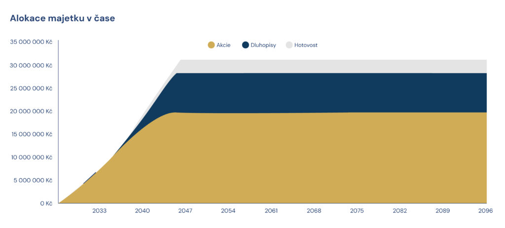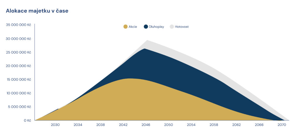 Naopak pracuje s předem definovaným časovým horizontem. Klient si stanoví, jak dlouho chce kapitál čerpat, a tomu přizpůsobí výběry. V praxi to znamená, že nečerpá pouze výnosy, ale postupně „ukrajuje“ i ze samotného kapitálu. Výsledkem je vyšší renta v kratším čase, ale za cenu toho, že portfolio se postupně vyčerpá.